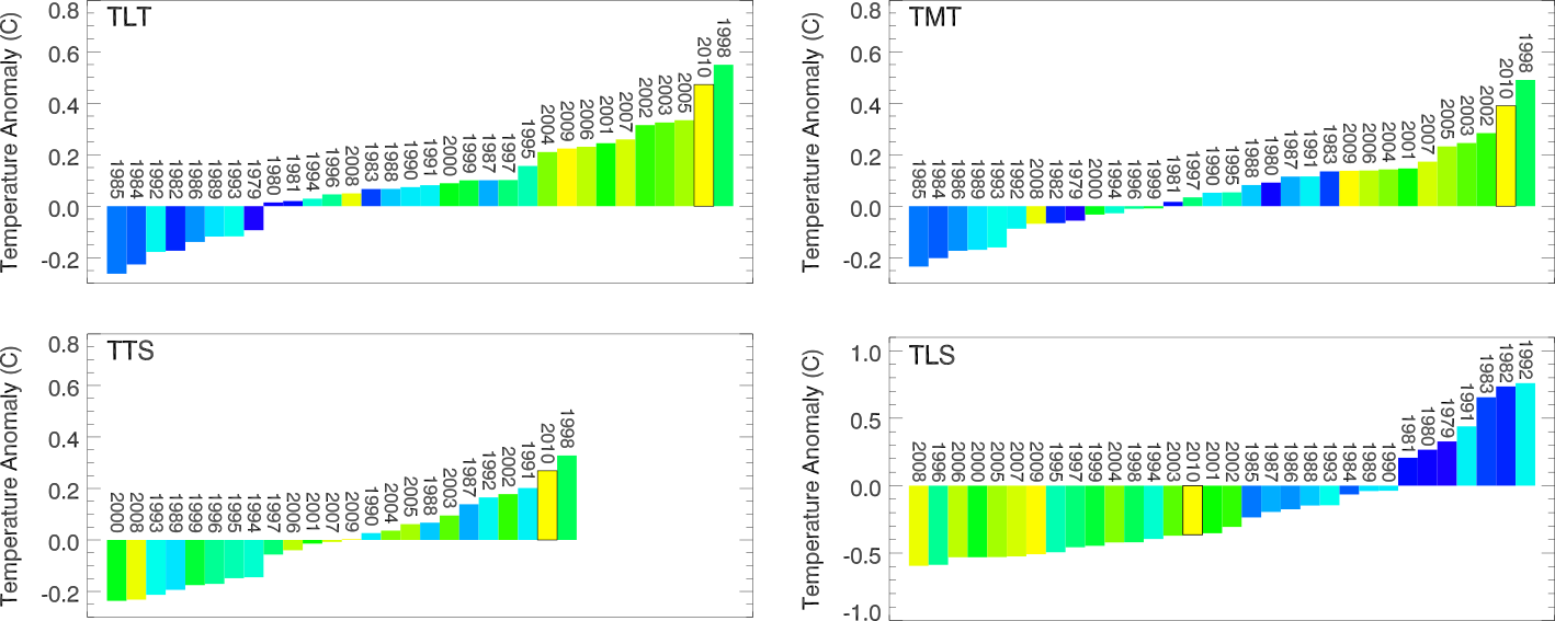 In the RSS dataset, 2010 was the second warmest year on record in the lower troposphere (TLT), the middle troposphere (TMT), and near the tropopause (TTS). This can be seen in the plot below, which shows the average global temperature anomalies for each of MSU/AMSU channel. The anomalies are sorted from low to high and are represented by bars color-coded by the year that the anomaly occurred. Blue represents the beginning of the time series in 1979, and yellow represents the last complete year, 2010. In most surface temperature datasets, 2010 was the warmest year on record, often followed by 2005, which differs slightly from our results, where the warmest year in the troposphere is 1998. For the lower stratosphere, 2010 was cooler than the 1979-1998 mean, but was not an extreme year, falling near the middle of the distribution.